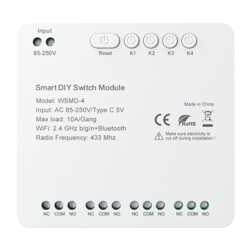 Az Avatto WSMD-4 250V modul 85-250 V-os váltakozó feszültségtartományban vagy USB-C 5 V-os tápegységgel működik, így otthoni telepítésekben és barkácsprojektekben egyaránt használható. Minden csatorna akár 10 A terhelést is támogat, így biztosítva a különböző eszközök biztonságos vezérlését a világítástól az automatizálási rendszerelemekig. A robusztus felépítés, valamint a CE és RoHS tanúsítványok garantálják a megbízható működést és a túlterhelés elleni védelmet.