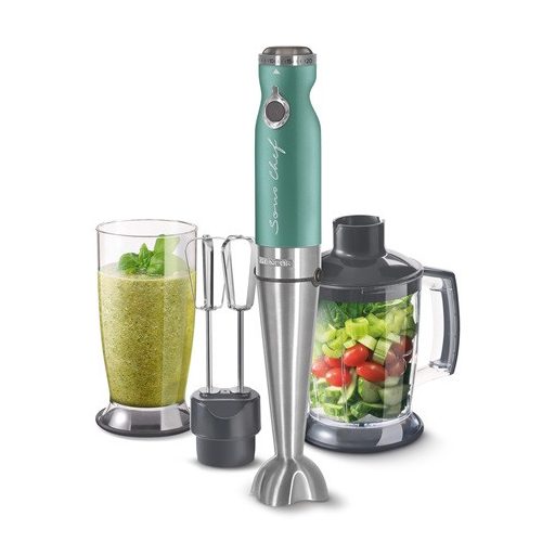 A Sencor SHB 5601GR botmixer krémlevesek, szószok, bébiételek gyors elkészítésében nyújthat Önnek segítséget. A 1200 W teljesítményű motor változtatható sebesség funkcióval lett ellátva. A Titanium Quad Blade Technológia alapján készült aprító pengék pedig forró ételek készítésére is alkalmasak. Az ergonomikusan kialakított markolat biztos és kényelmes fogást garantál. Az 800 ml-es fedeles keverőpohár segítségével nagy mennyiségű alapanyag is feldolgozható vagy akár mérőedényként is használható, továbbá megtalálható egy 1250 ml kapacitású edény is, mely aprításra kiválóan használható.