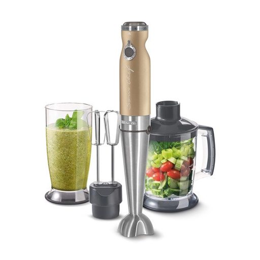 A Sencor SHB 5607CH botmixer krémlevesek, szószok, bébiételek gyors elkészítésében nyújthat Önnek segítséget. A 1200 W teljesítményű motor változtatható sebesség funkcióval lett ellátva. A Titanium Quad Blade Technológia alapján készült aprító pengék pedig forró ételek készítésére is alkalmasak. Az ergonomikusan kialakított markolat biztos és kényelmes fogást garantál. Az 800 ml-es fedeles keverőpohár segítségével nagy mennyiségű alapanyag is feldolgozható vagy akár mérőedényként is használható, továbbá megtalálható egy 1250 ml kapacitású edény is, mely aprításra kiválóan használható.